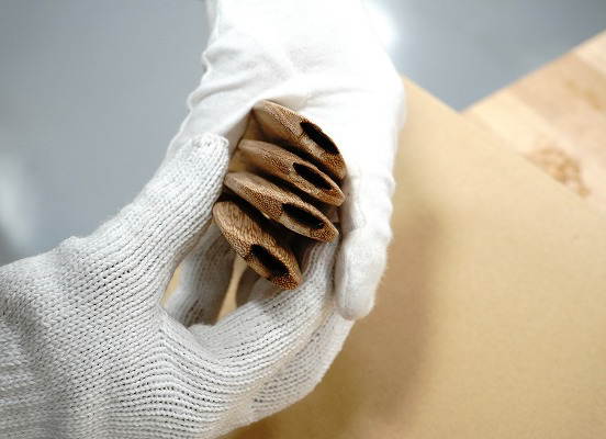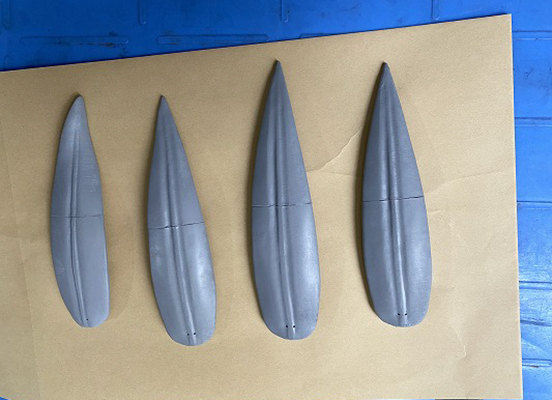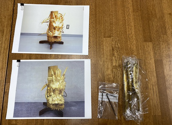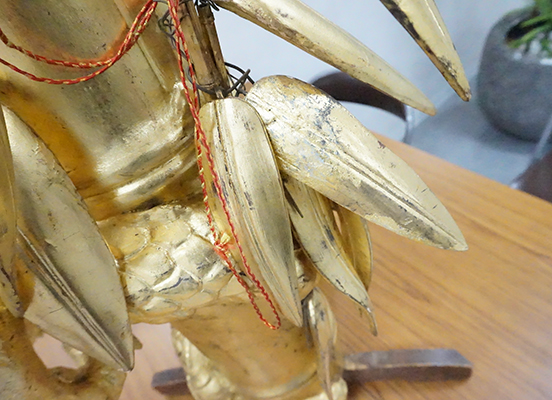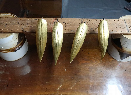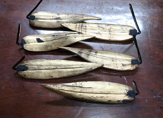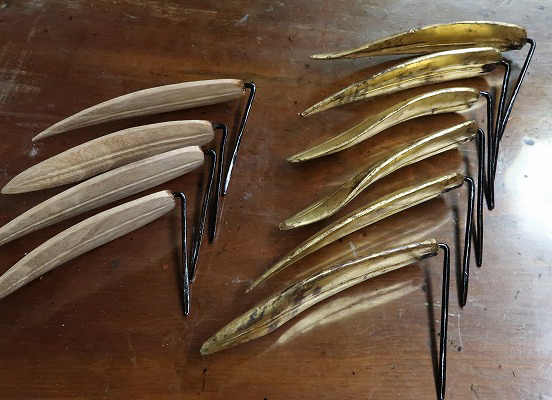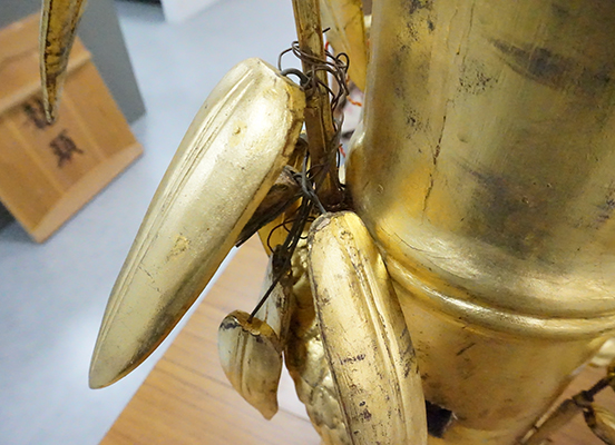 損傷部品で鉾留には取付けしていない部品を参考に新調する笹の形状を町内と林監修者とで協議。林監修者からは、形状の基準となる樹脂模型を製作していただき、これを基に桐材で復元新調を行った。茎を入れる部分には1㎜の溝を掘り、鉄軸が入る道を事前に加工しておいた。