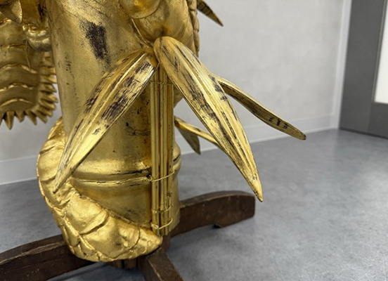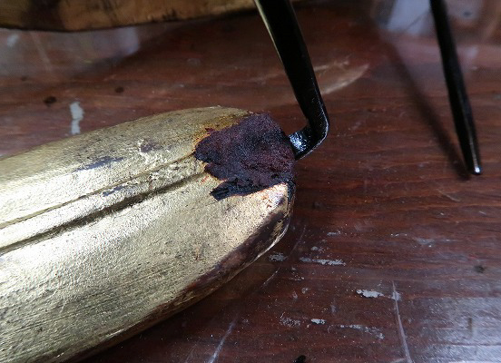 木地固め後、鉄軸を取り付けるために彫りこんだ部分をコクソで整形。下地を付け、塗りを行い、箔押しを行った。その後、既存の笹の擦れ傷を確認しながら、同じような擦り傷をつけ調子を整えた。