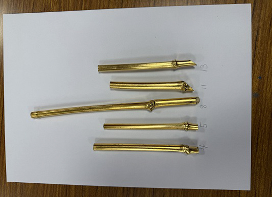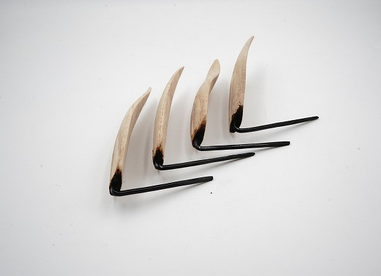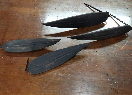 次に笹の茎部分の鉄軸部分においても、ピアノ線を熱し、鍛造して先端の平な部分を整形するとともに焼き入れを行った。次に漆を焼き付けした。