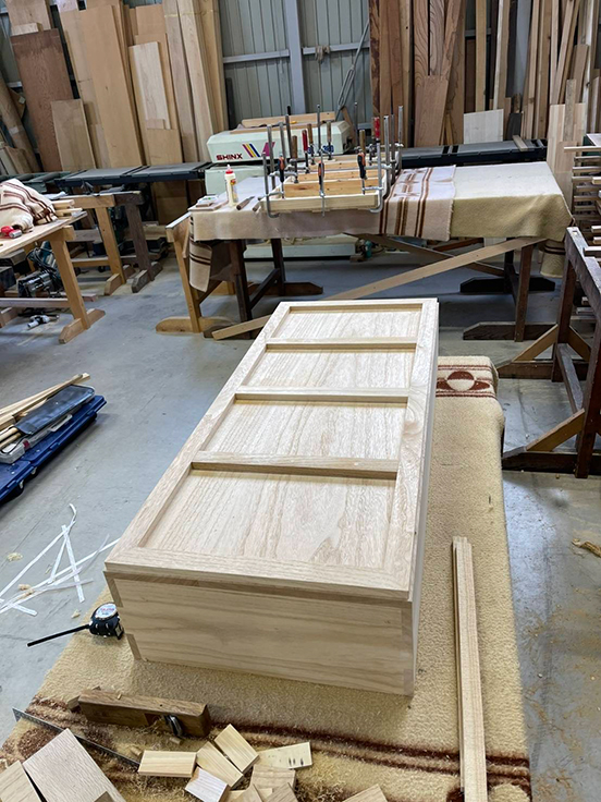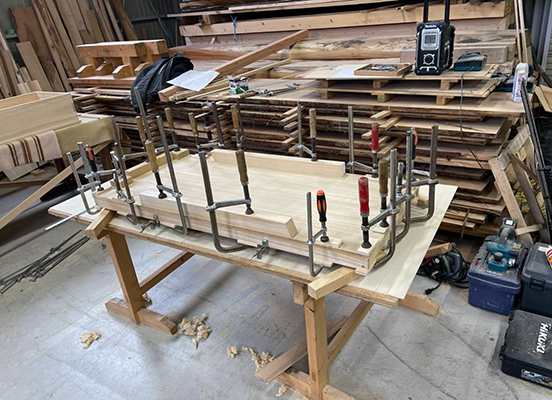 枠、補強材、受け台を制作し、順に仮組みを行う。その後、接着材を注入し、本組を行いクランプで固定させ、接着乾燥。その後、鉋で仕上げ、金具と取付けし、文字入れを行った。