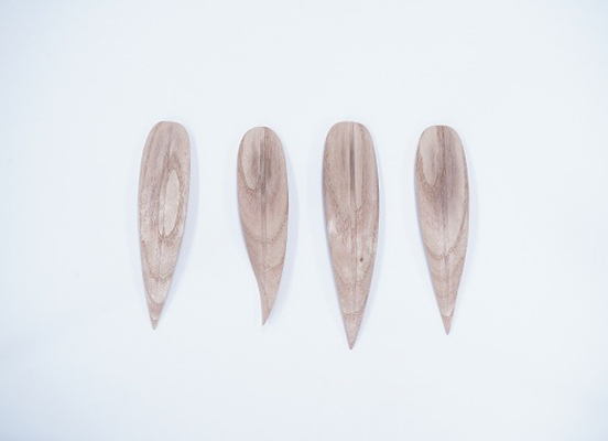 損傷部品で鉾留には取付けしていない部品を参考に新調する笹の形状を町内と林監修者とで協議。林監修者からは、形状の基準となる樹脂模型を製作していただき、これを基に桐材で復元新調を行った。茎を入れる部分には1㎜の溝を掘り、鉄軸が入る道を事前に加工しておいた。