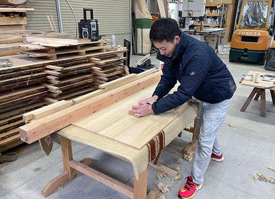 図面を確認しながら、木材の製材。