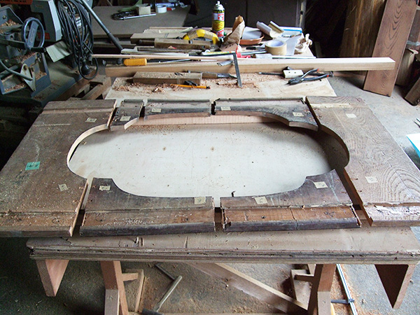 割れていた部分を切断し、新しい材を継ぎたし雇い実で組み立てる。